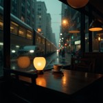 Cozy Café Interior with Rainy Window and Foggy Cityscape at Dusk