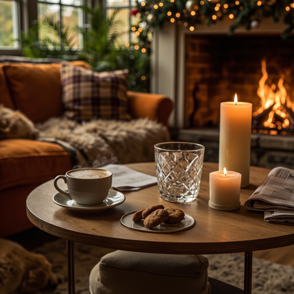 A cozy living room: a steaming cup of coffee sits on a smooth, wooden table, and next to it is a plate of cookies. In the background is a plush orange sofa with a checkered pillow. A dog is sleeping on a fluffy rug by the fireplace. Soft warm light from the garlands and fireplace creates a welcoming atmosphere. On the table there are glasses, coffee, a large candle in a transparent candlestick and a newspaper. There is a lot of greenery and light around. Dog on a blurred background.[статичный кадр]