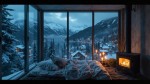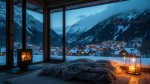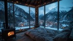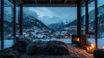 Winter Night, Cozy Interior, Floor Bed, Heater, Modern Clean, Glass Wall, Beautiful Mountain Village View