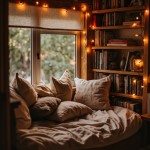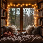 Cozy Reading Nook with Bookshelves, Fairy Lights and Window Seat