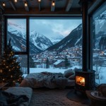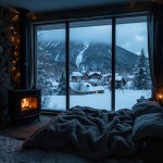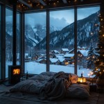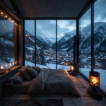 Winter Night, Cozy Interior, Floor Bed, Heater, Clean Modern, Glass Wall, Beautiful Village View, High Mountain Region