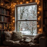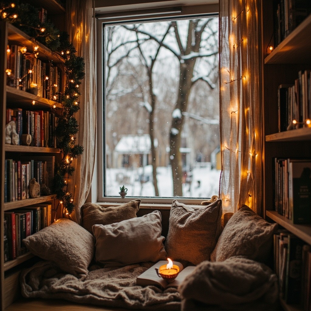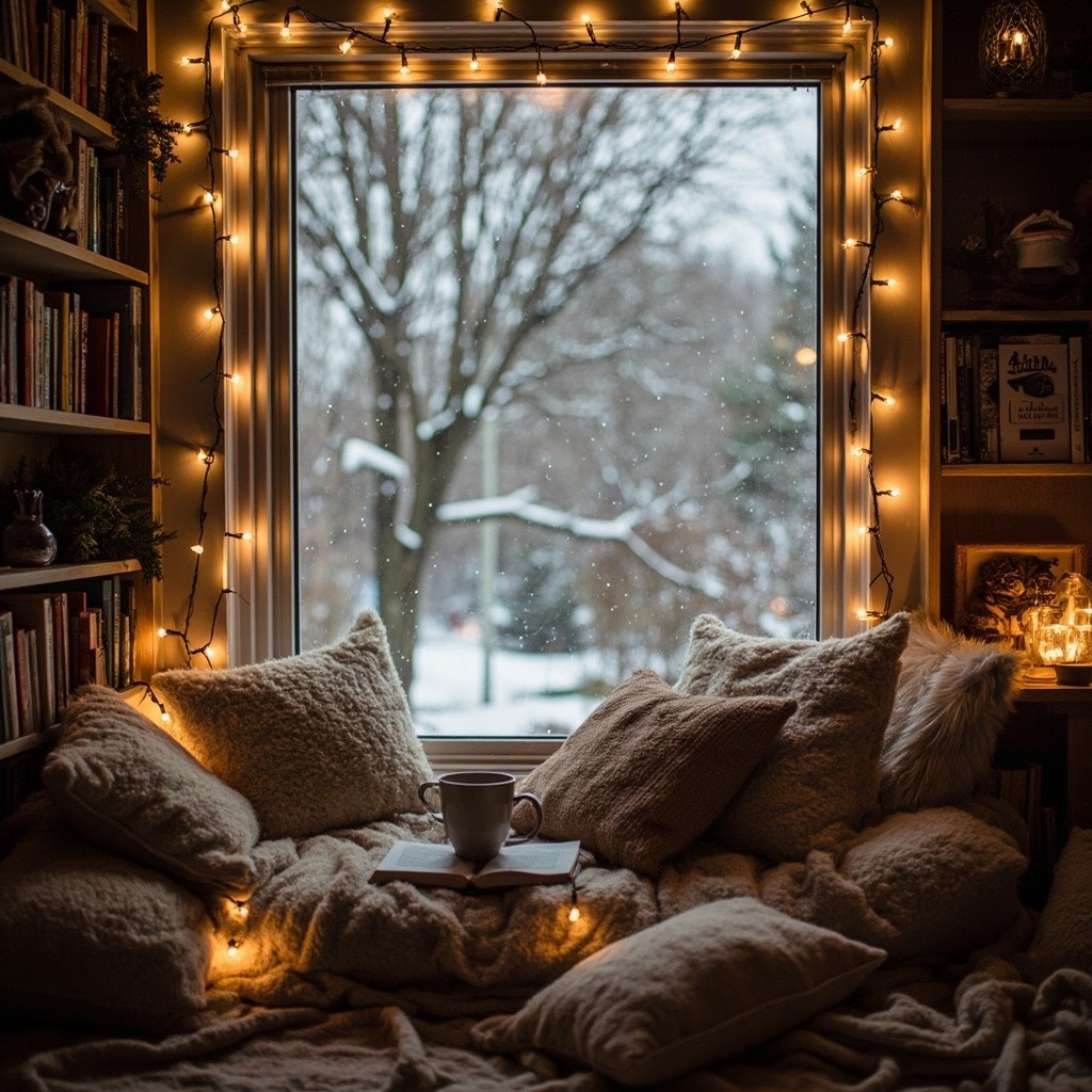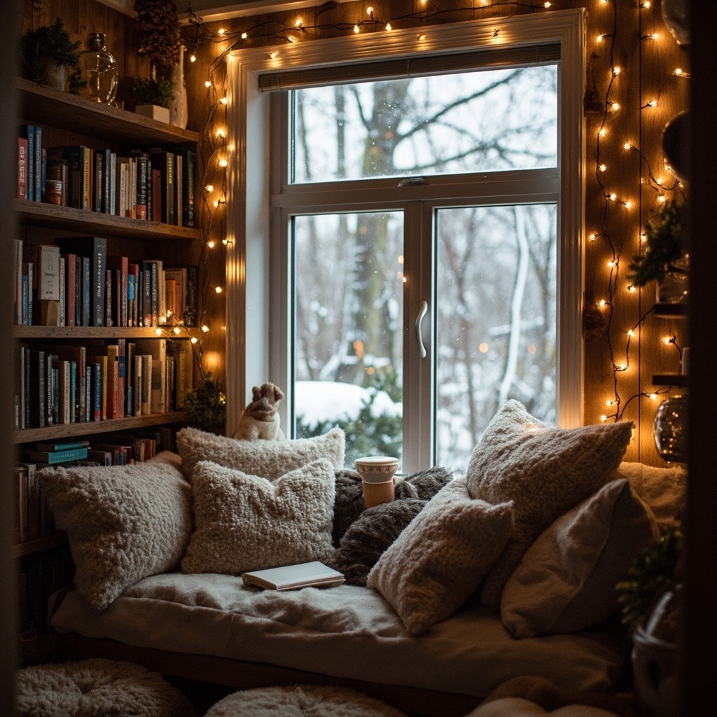 Winter Reading Nook with Bookshelves, Fairy Lights, and Coffee Cup
