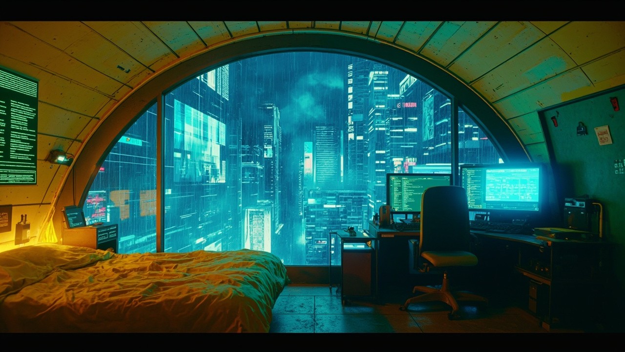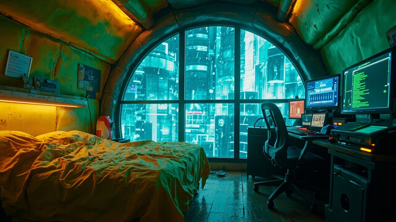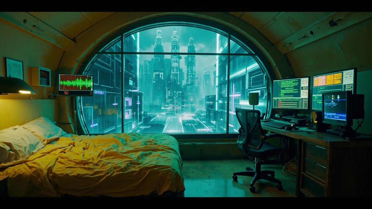 cyberpunk-style futuristic lbedroom with a large, semi-circular glass window opening to a glowing neon-blue cityscape. The view outside shows tall holographic buildings, floating ads, and rainy reflections on metallic surfaces, evoking a Blade Runner-like atmosphere. Inside the room, on the left, there’s a slightly messy bed with yellow sheets and a soft, warm light casting amber tones across the fabric. The bed faces a workstation filled with multiple computer monitors, keyboards, and blinking lights, suggesting a hacker or programmer's setup. One monitor shows green-coded lines, another has a bright blue interface. The room’s walls are curved, metallic, and tinted greenish-yellow. A small wall-mounted screen displays a waveform or data readout. Near the bed, on the left wall, there are a few framed photos or posters. The floor is a worn wooden texture. A rolling office chair is placed at the workstation. The overall lighting is moody and cinematic, combining warm interior tones with cool exterior neon blues. The ambiance suggests solitude and tech obsession in a futuristic dystopian city. Style: Hyper-realistic, cinematic lighting, cyberpunk aesthetic Resolution: 4K quality Mood: Melancholic, immersive, high-tech dystopia Camera Angle: Wide interior shot, slightly low eye-level perspective Environment: Indoor-outdoor blend, tech-focused, rain-soaked neon city outside.