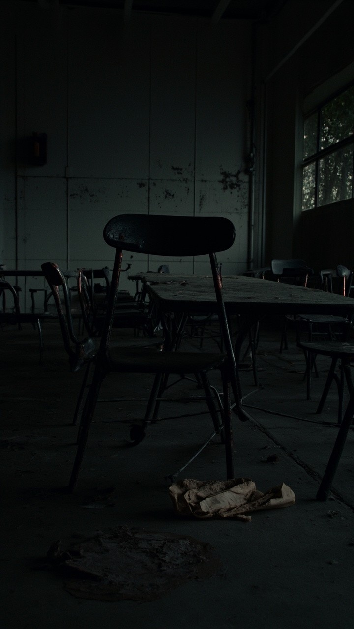 Abandoned School Cafeteria with Damaged Furniture and Rotten Food