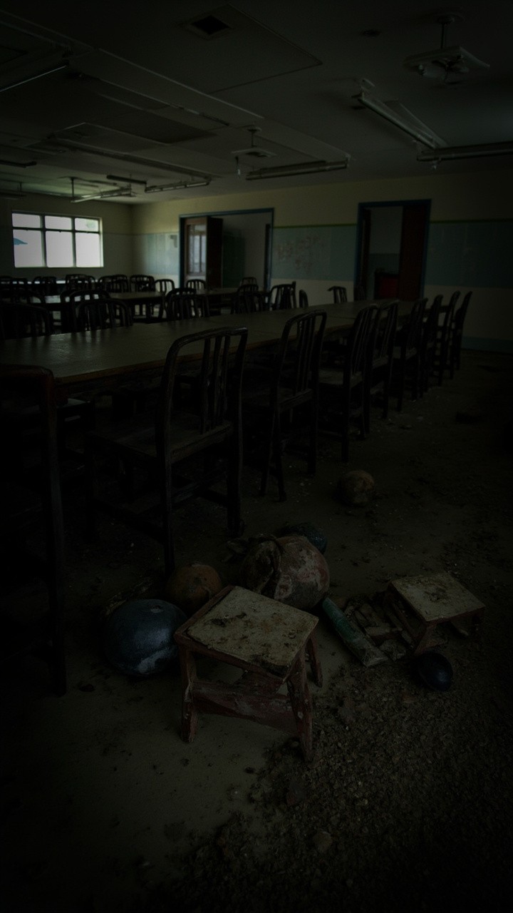Abandoned School Cafeteria with Damaged and Dirty Furniture