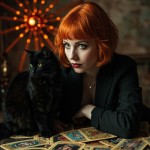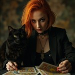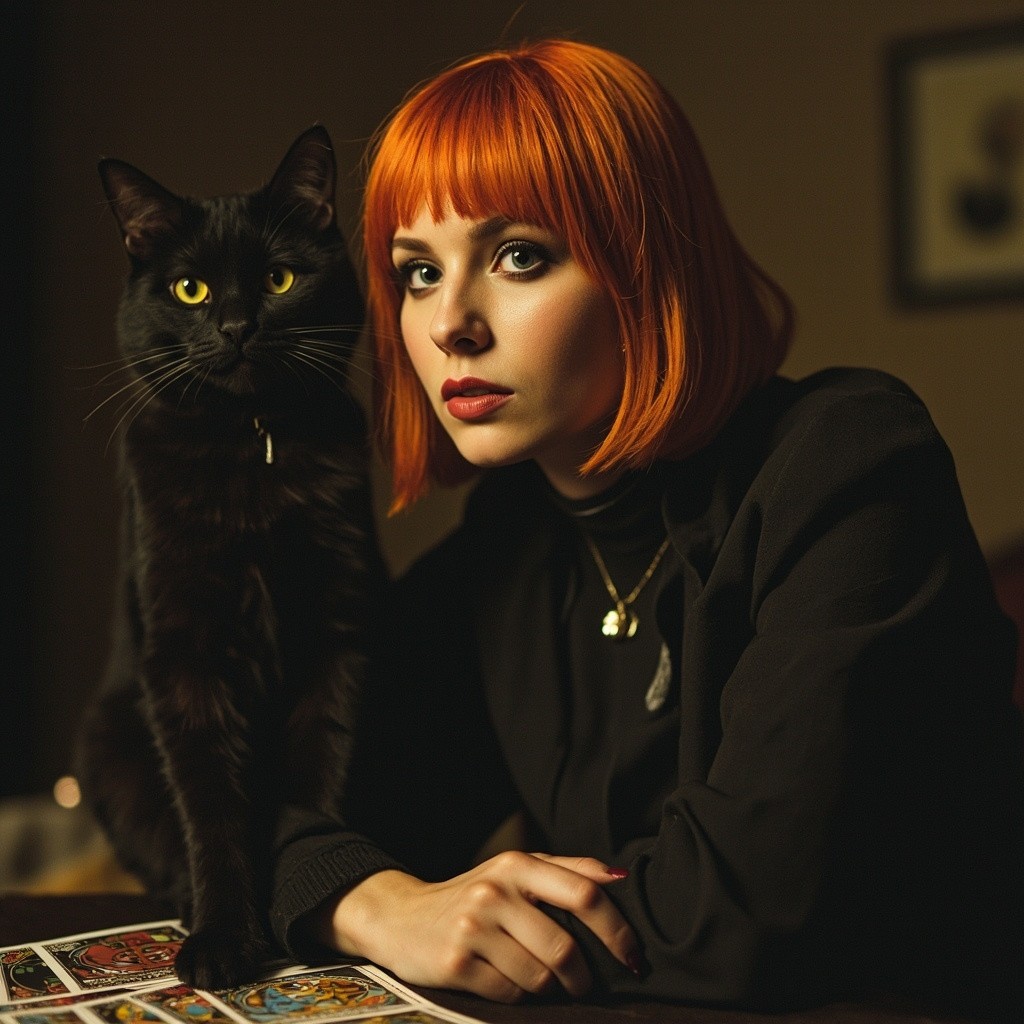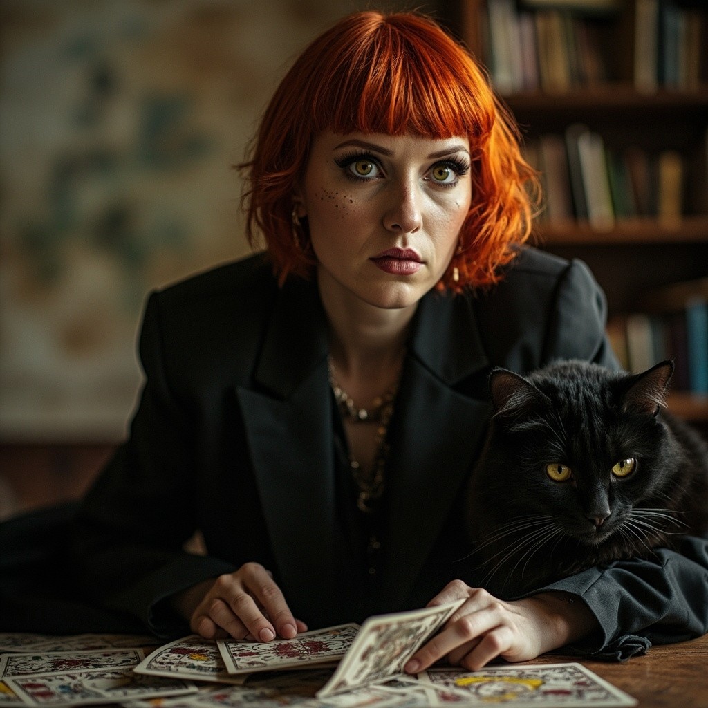 Dark-Punk Woman Reading Tarot Cards with Bobbed Orange Hair and Black Cat