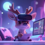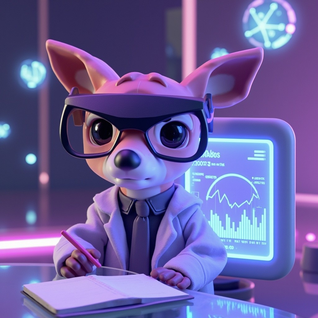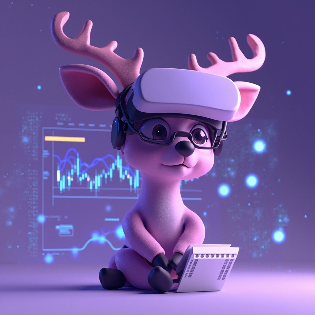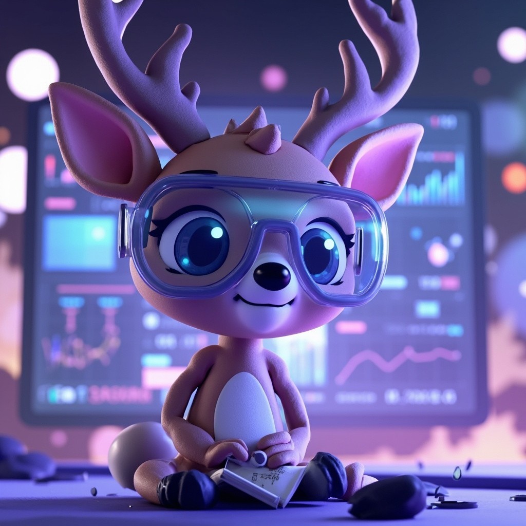 3d, A cute anthropomorphic Risk Analyst with glasses. serene deer with a digital twin hologram vr glasses taking notes, big dashboard screen behind, showing finance plots, analyzing data streams, in a futuristic bank with glowing data orbs in the background, soft purple shades, large gentle eyes, game-like aesthetic, high resolution,