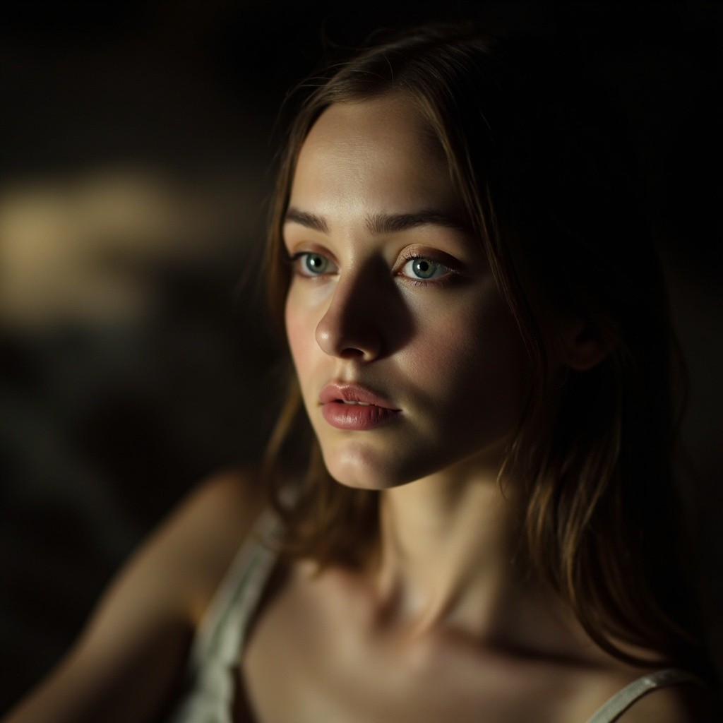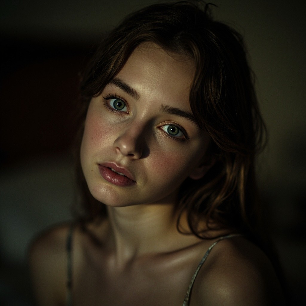 a photo of a young woman, age 18, face; Ethereal beauty, Delicately fragile, Refined elegance, youthful, sharply delicate fine-boned features, angular and lean, narrow elongated diamond face shape, tapered lower face, high gently pronounced cheekbones with natural hollowing beneath, slim refined jawline, small softly pointed chin, high smooth forehead, thin softly arched eyebrows, very fair smooth porcelain skin with cool undertones, medium almond-shaped eyes, slightly elongated, slightly downturned outer corners, slightly wide-set, deep blue-green eyes, slender straight nose with refined narrow bridge and soft pointed tip, naturally full soft lips, gentle cupid’s bow, slightly downturned corners, long straight mahogany hair, celtic-germanic heritage, Physique; very slender, willowy build, narrow shoulders, fine-boned frame, small natural bust, slim straight torso with subtle waist taper, narrow hips, long thin limbs, elongated proportions, minimal muscle definition, soft delicate silhouette, vulnerable, innocently seductive, bedroom setting; dark with soft warm light