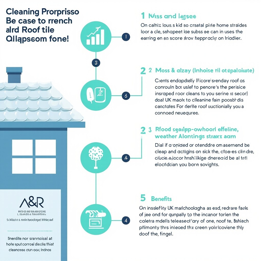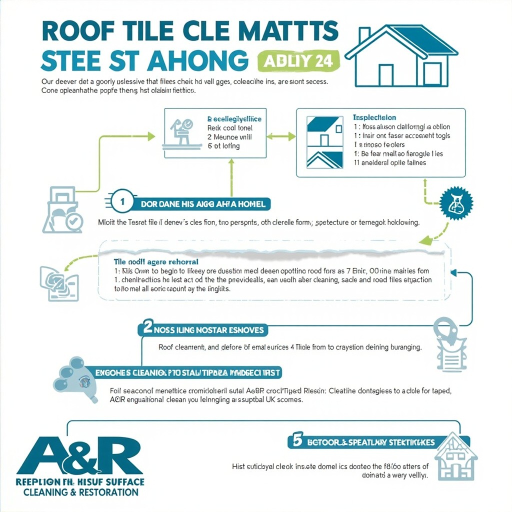 "Create a visually appealing, professional infographic illustrating the roof tile cleaning service process for a residential home. Include clear sections showing: 1) Inspection, 2) Moss and algae removal, 3) Roof cleaning with safe equipment, 4) Roof sealing for long-term protection, 5) Benefits such as extended roof lifespan, weather protection, and cost savings. Use icons, arrows, and numbered steps for easy understanding. Color palette should be clean and professional (blues, greens, and neutral tones). Include a small subtle branding element for A&R Roof & Hard Surface Cleaning & Restoration without dominating the design. Make it suitable for blogs, social media, and marketing, with a focus on suburban UK homes."