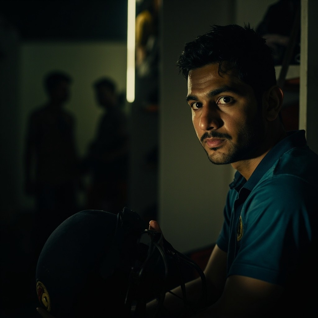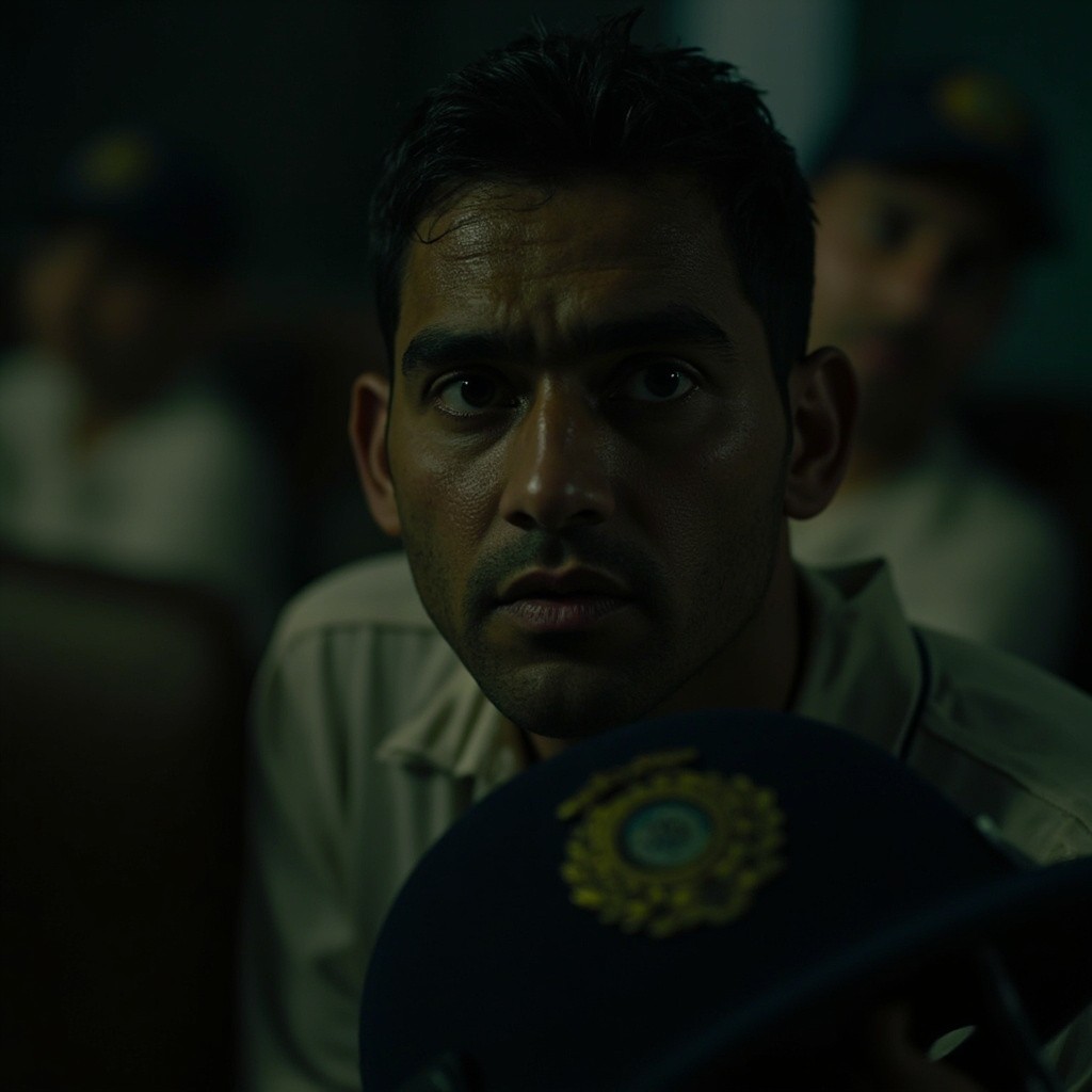 Indian Cricketer Resembling MS Dhoni in Dressing Room with Selectors Silhouettes