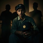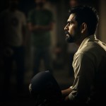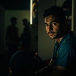 3️⃣ Rejection & Determination Prompt: Cinematic close-up of a determined young Indian cricketer resembling MS Dhoni sitting alone in dressing room, holding helmet, sweat on face, dim tungsten light, selectors’ silhouettes blurred in background, intense focus in eyes, emotional resilience, shallow depth of field, realistic sports drama scene, vertical 9:16.