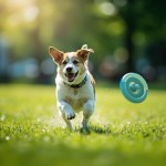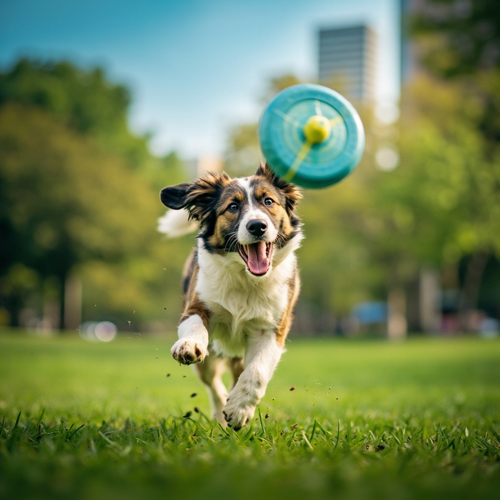 Energetic Dog Chasing Frisbee in Vibrant City Park