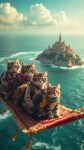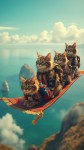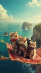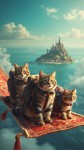 Russian Tourist Cats Family Flying to Island on Magic Carpet