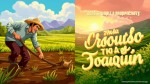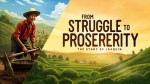 Escena dividida en dos: a la izquierda un granjero trabajando con herramientas tradicionales en el campo, a la derecha un paisaje verde y fértil al amanecer, con texto grande y dinámico: "De la lucha a la prosperidad" - La historia de Joaquin, estilo ilustrativo con detalles realistas, colores cálidos y energéticos.