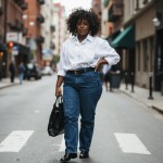 show head to toe shot but on a city street. create a 40 year old black women who is chic and fashionable. She should be pretty with hair in a natural curly style. She is a PLUS size, wearing White button down cotton shirt buttoned up and tucked into her straight jeans. She should wear chunky gold earrings. Give her a black belt. Shoes should be a loafer in black. She should carry a larger tote bag.