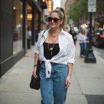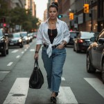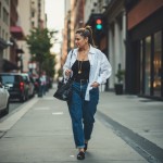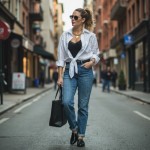 show head to toe shot but on a city street. create a 40 year old women who is chic and fashionable. She should be pretty with a high pony tail. She is a PLUS size, wearing White button down cotton shirt worn open and tied at waist and over a black tank top that is tucked into her barrel cut jeans. She should wear chunky gold chains with one being a puffy heart. Give her a black belt. Shoes should be a loafer in black. She should carry a larger tote bag.