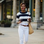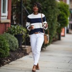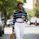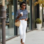 Create a 40 year old black woman who is an influencer walking with coffee, with short hair red lipstick who is fit. she is wearing a navy and white horizontal BRETON stripe cotton crew neck sweater, with white tee underneath over white fitted jeans and brown strappy sandals and a brown belt with straw bag.