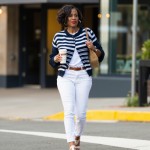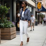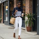 Create a 40 year old black woman who is an influencer walking with coffee, with short hair red lipstick who is fit. she is wearing a navy and white horizontal stripe cotton crew neck sweater, with white tee underneath over white fitted jeans and brown strappy sandals and a brown belt with straw bag.