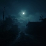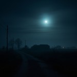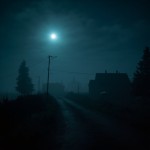 Moonlit Foggy Village with Distant House at Night