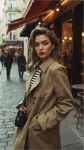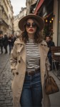 French Girl in Trench Coat and Striped Top on Paris Cobblestone Street