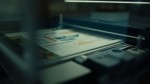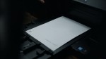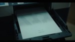 a photorealistic image of an A4 poster that is sitting on a printer tray as if it had just come out of the printer and is hot off the press.. the framing of the image is a little offset and framed artistically to make for a less polished and rigid visual, but it still looks intentional. It's a medium close-up shot with no additional props. the colours are muted and the contrast is high with graphic shadows. shot with a 50mm camera in an urban, editorial space. keep it minimal and mostly monochromatic