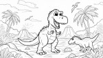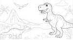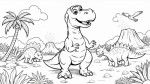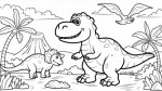 Children's Coloring Book Illustration of Smiling Cartoon Tyrannosaurus Rex, Baby Triceratops, and Pterodactyl in Prehistoric Landscape