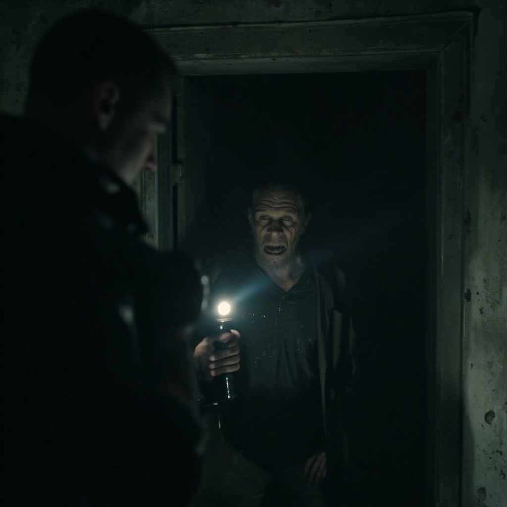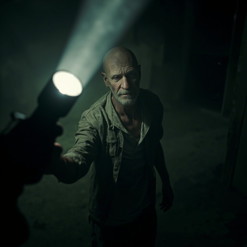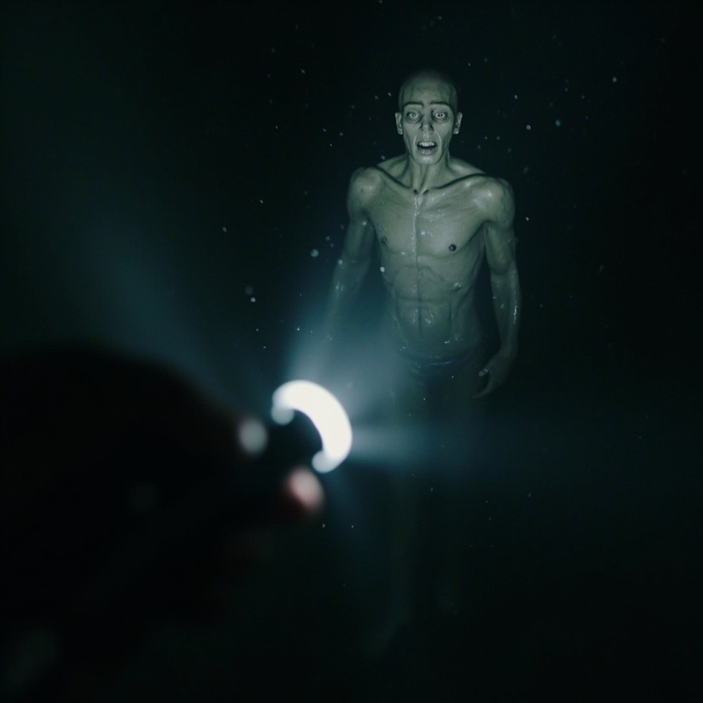 @𝑅𝐴𝑍𝐴𝑁:First-person POV walking shot, found-footage realism. Handheld camera movement with a natural walking gait: subtle vertical bob and side-to-side sway. A handheld flashlight is the primary light source, its beam reacting with a slight delay and imperfect scanning motion. The character in frame is completely frozen and lifeless: no breathing, no blinking, zero animation. Cinematic gritty textures, floating dust motes, low light, heavy shadows. Consistent environment throughout the shot."