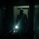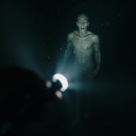 First-Person POV Walking Shot with Handheld Flashlight and Frozen Character in Low Light