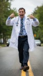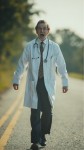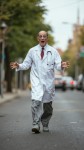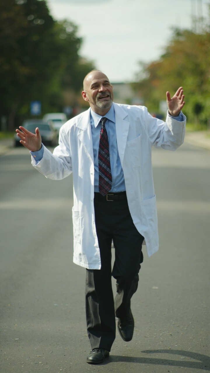 Man Walking on Road in Humorous Manner Dressed as Doctor