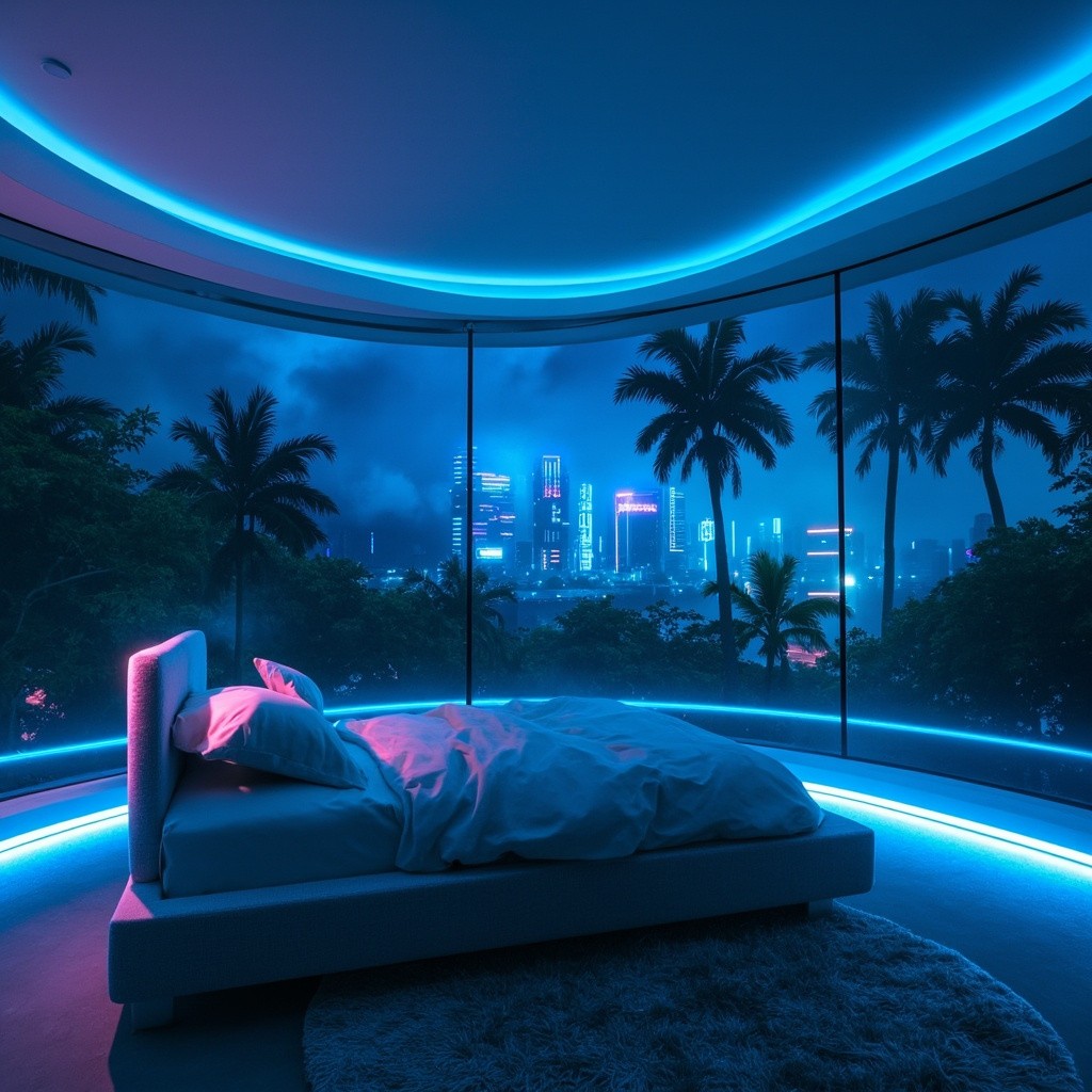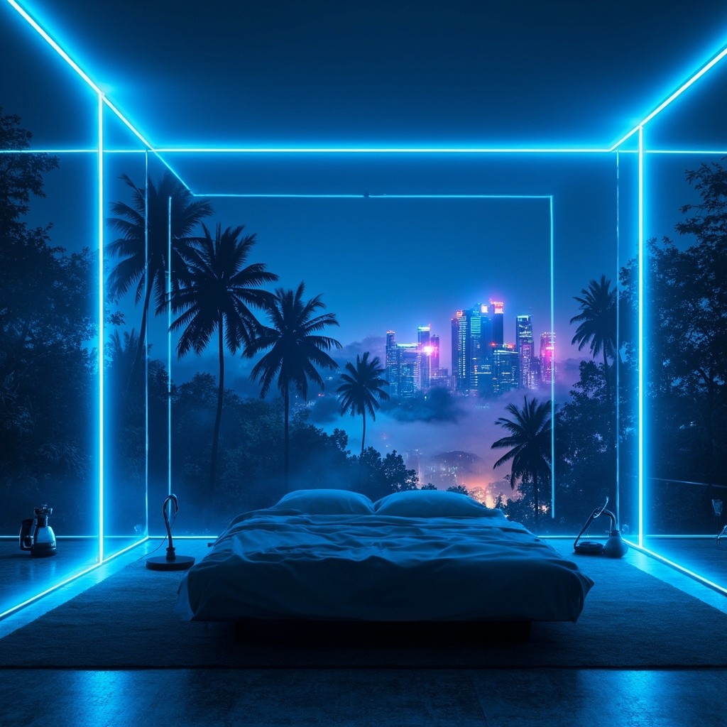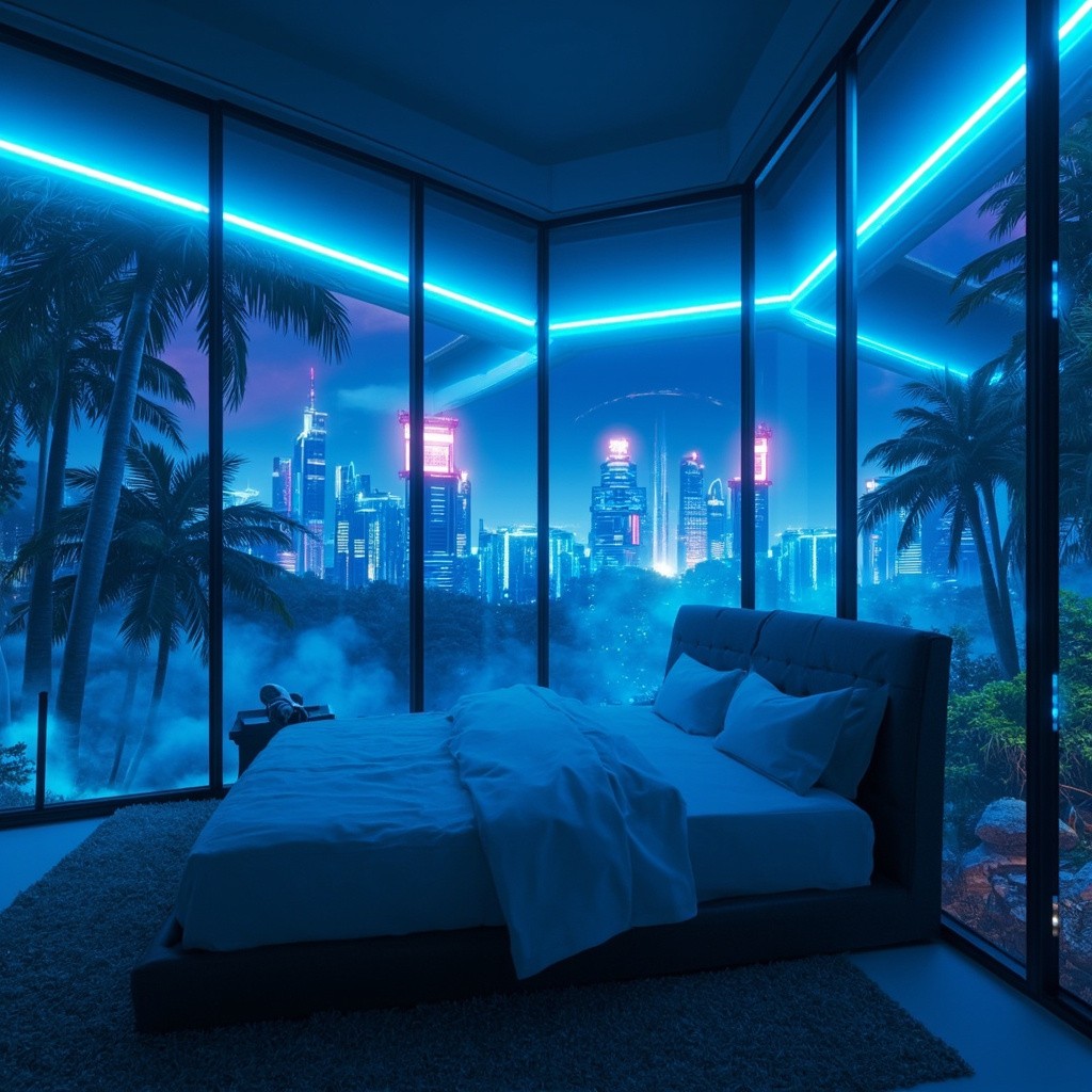 Futuristic bedroom interior at night with large panoramic glass window, sleek minimal bed facing the window, soft blue neon light outlining the window frame, view of a misty tropical forest with tall palm trees and a glowing cyberpunk city skyline in the background, skyscrapers with neon holographic billboards, dreamy blue and purple lighting, cinematic, ultra-realistic, ambient mood