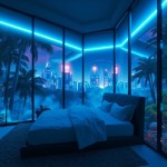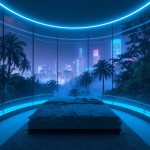 Futuristic Bedroom Interior with View of Cyberpunk City and Tropical Forest