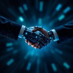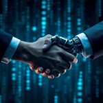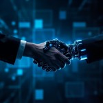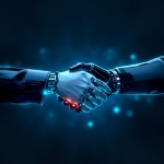 Close-Up Handshake Human AI Robot Futuristic Finance Scene