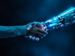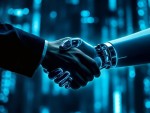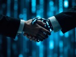 Close-Up Handshake between Human and Robot in Futuristic Financial Scene