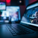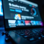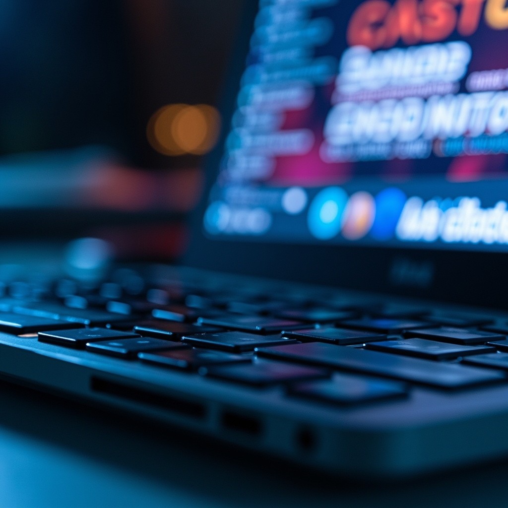 Close-Up Laptop with Flying Keys and Blurred Browser Window Background in Futuristic Style