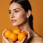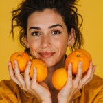 Natural Adult Girl Holding Oranges on Green Background