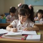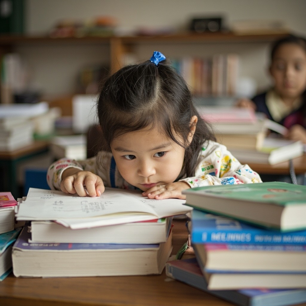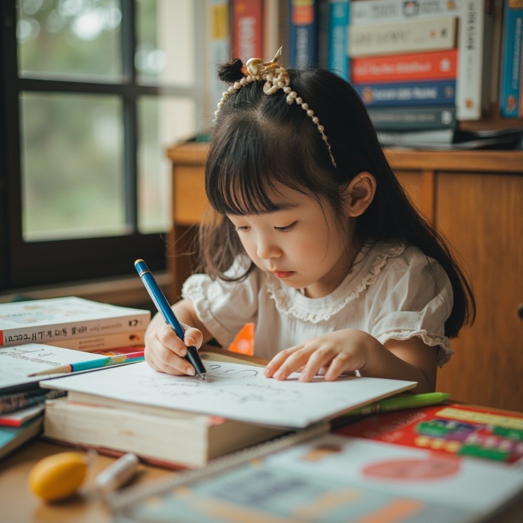 Little Girl Playing with Stationery Instead of Studying at Desk