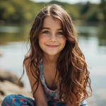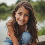 a girl with long, wavy chestnut hair, large and bright eyes with a brilliant blue color, smooth and fair skin, a natural and charming smile, a slim and fit figure with energetic movements, and a style that includes simple and comfortable clothing like a lightweight top and jeans with colorful and attractive patterns. Sitting next to a river