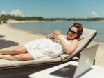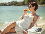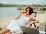 Smiling Girl with Burgundy Pixie Cut Drinking Cocktail on Beach Lounge