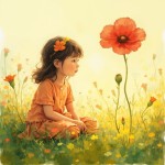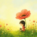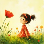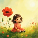 Children's Book Style Illustration of Cute Girl on Grass with Big Red Flower