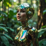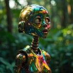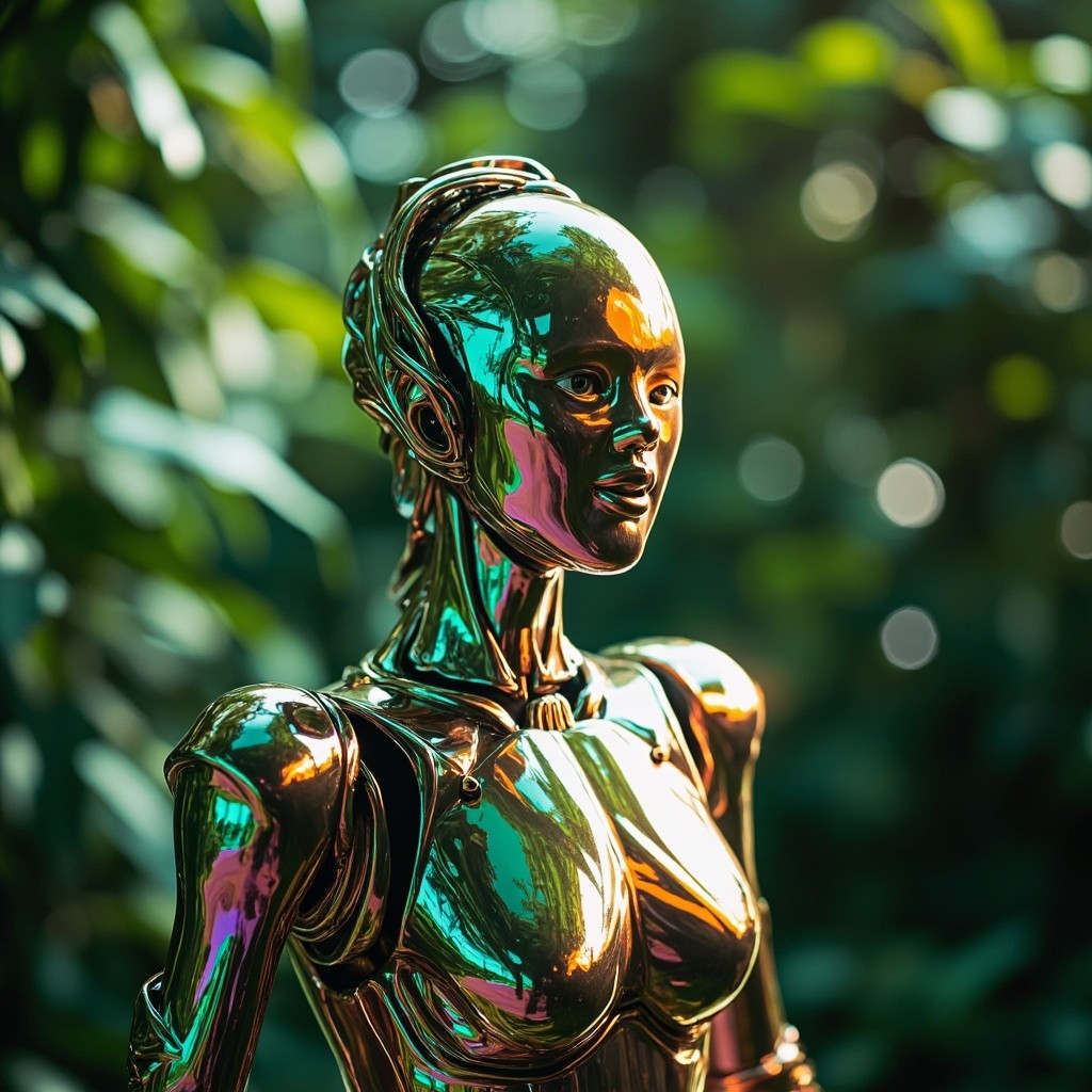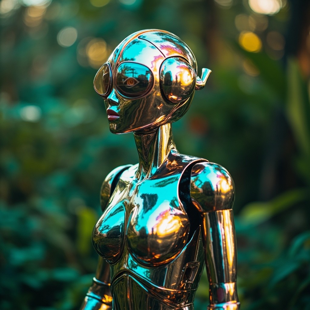 Rainbow Reflective Sleek Robot with Surprised Happy Expression in Jungle