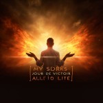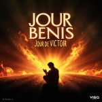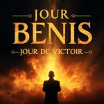 Create a realistic professional YouTube thumbnail for my video JOUR BENIS JOUR DE VICTOIR add realistic images, attractive colors and clickbait youtube thumbnail make the title bold and stand with high quality. Add image of a person praying with flames of glory surrounded the person and spiritual atmosphere around it
