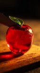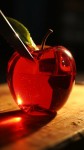 A hyper-realistic, translucent red glass apple with a glossy surface and green glass leaf on top, being slowly sliced in half with a sharp stainless steel knife. The apple rests on a scratched wooden cutting board under focused warm lighting. Fine cracks and light reflections shimmer across the cut surface. Ultra close-up, cinematic ASMR mood, shallow depth of field."