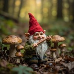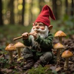 Gnome in Red Hat Playing Flute in Woods with Mushrooms and Acorns