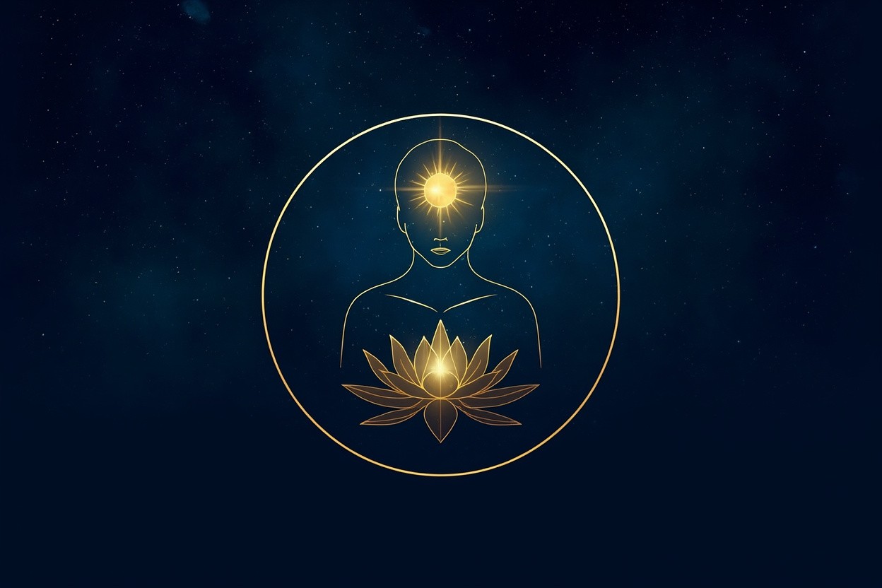 Jeśli SplitShire dobrze reaguje na słowa kluczowe, użyj tej: Luxury astrology Pinterest banner, conscious living and spiritual growth theme. Dark blue cosmic background with stars and soft golden light. Golden line art human figure with third eye star, symbol of intuition and awareness. Lotus flower below the figure, cosmic colors, symmetrical and elegant. Sacred geometry circle, minimal composition, premium spiritual aesthetic. No text, clean space, calm mood. Horizontal banner format.