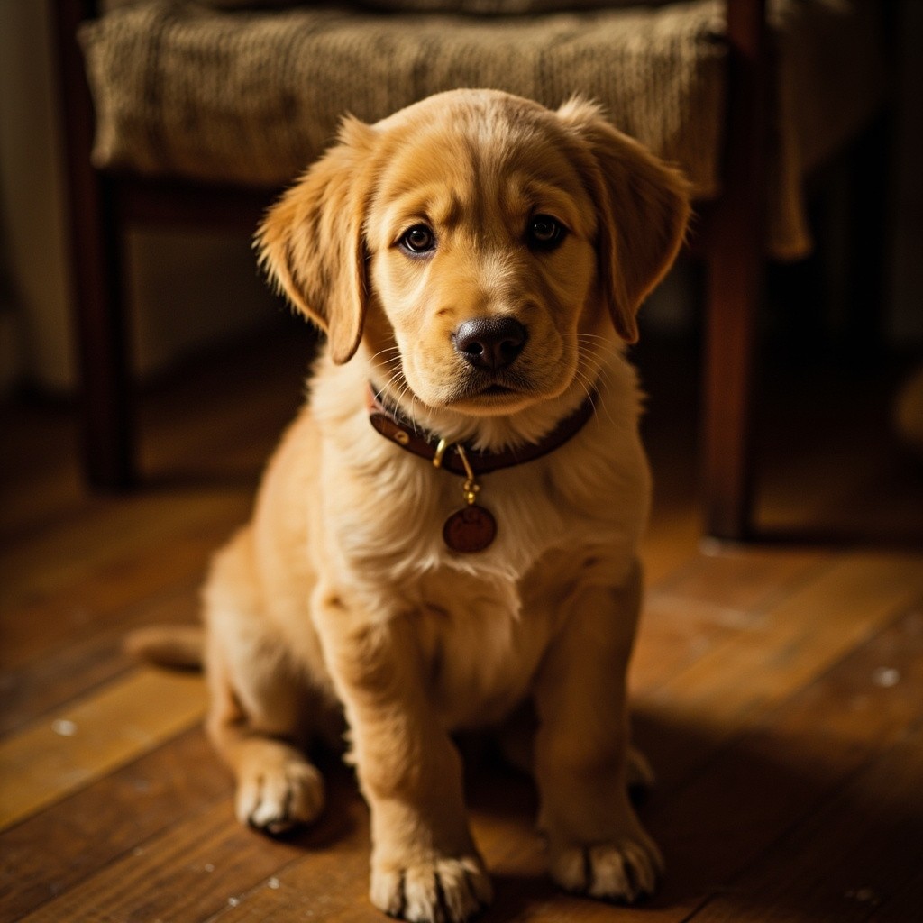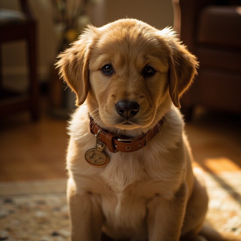 golden retriever puppy, warm honey fur, brown leather collar with oval tag, sitting upright, direct eye contact, calm dignified expression, cozy interior setting, warm golden hour light, soft bokeh background, wooden floors, knit textures, cinematic photography, 85mm portrait lens, film grain, warm amber tones --ar 1:1 --style raw --v 6