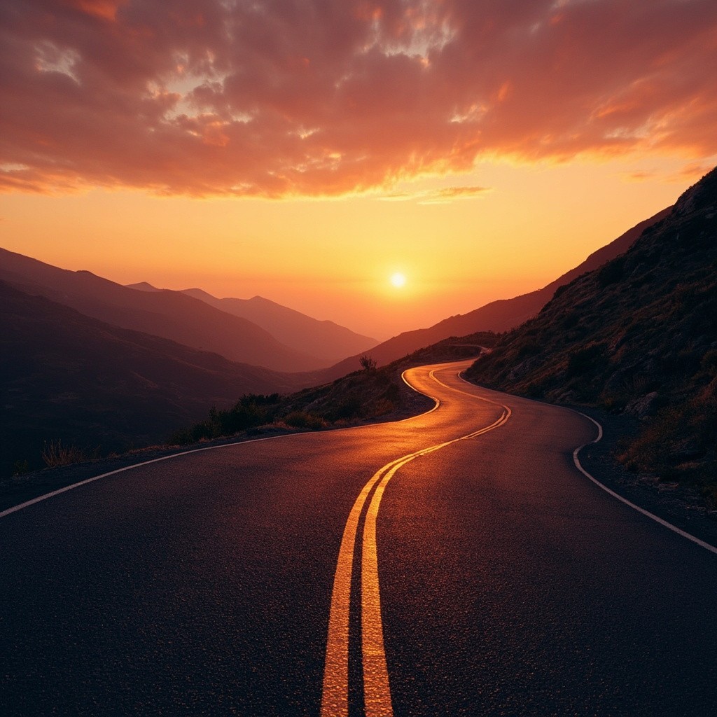 Winding Asphalt Road Towards Mountains During Golden Hour Sunset