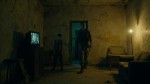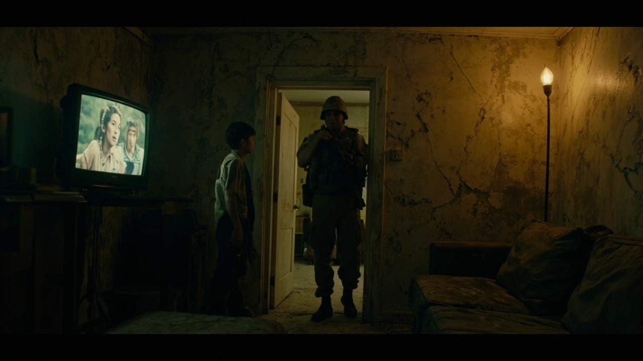 Cinematic interior of a rundown apartment, gritty and realistic. Cracked plaster walls with peeling paint and visible water stains. in the left corner of the room An old TV on a TV stand is showing an African soap opera. a young boy is standing to the right of the TV. Camera is behind a us soldier entering the room, looking at the young boy. an old dirty sofa is on the right side. The only light source is a bare incandescent bulb mounted on a floor lamp in the far right corner, casting harsh, directional shadows across the room. The atmosphere feels tense, intimate, and worn-down, with a sense of quiet desperation.", "style": "cinematic realism, gritty drama, high detail", "lighting": "low-key lighting, single practical light source from a floor lamp, strong shadows, warm bulb glow", "camera": "28mm lens, eye-level angle, shallow depth of field, film grain", "mood": "tense, bleak, intimate, claustrophobic", "color_palette": "muted browns, dirty yellows, desaturated blacks and grays", "environment_details": "dusty floor, chipped furniture, stained walls, minimal decor", "atmospheric_effects": "cigarette smoke haze, subtle volumetric light