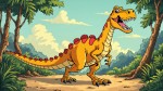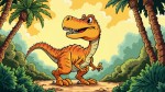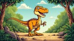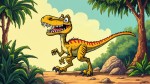 Colorful Velociraptor Caricature, Retro Cartoon Style, Full-Body Jurassic Jungle Scene