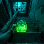 A highly realistic image of a glowing glass jar filled with neon green paint lying horizontally at the top of a cold concrete staircase in an abandoned industrial building at night. A human hand is seen gently pushing the jar forward. The environment is dim and atmospheric, illuminated by blue-green moonlight shining through broken windows. The jar is beginning to roll toward the stairs. The camera angle is a third-person top-down view, slightly behind the jar, emphasizing the cinematic depth of the scene. Broken glass, dust, and subtle reflections on the floor enhance the realism.