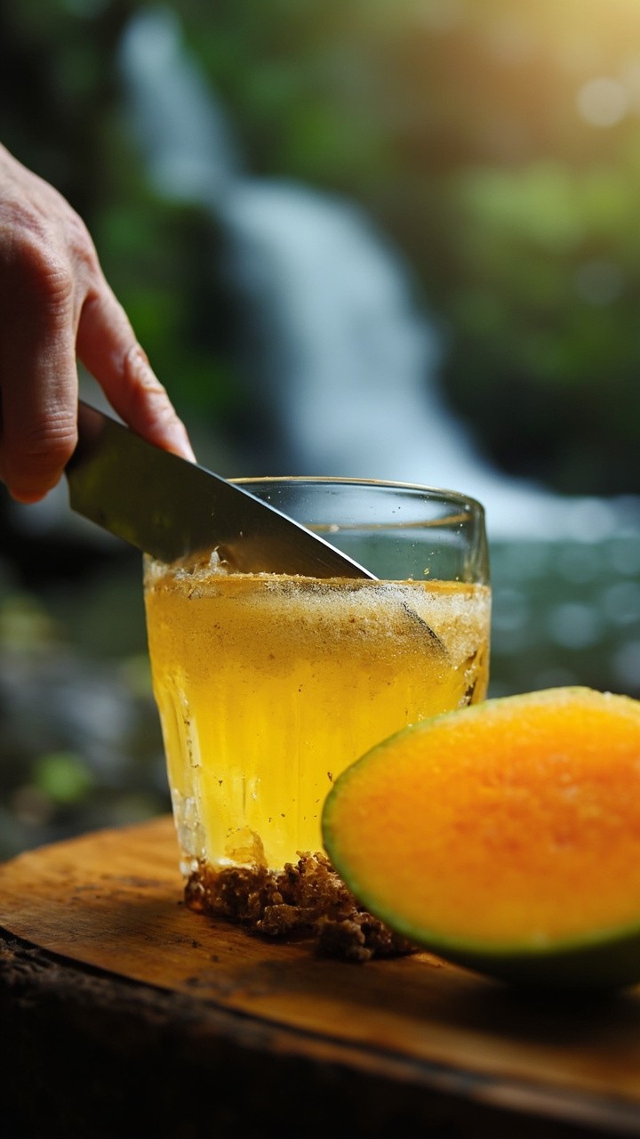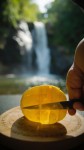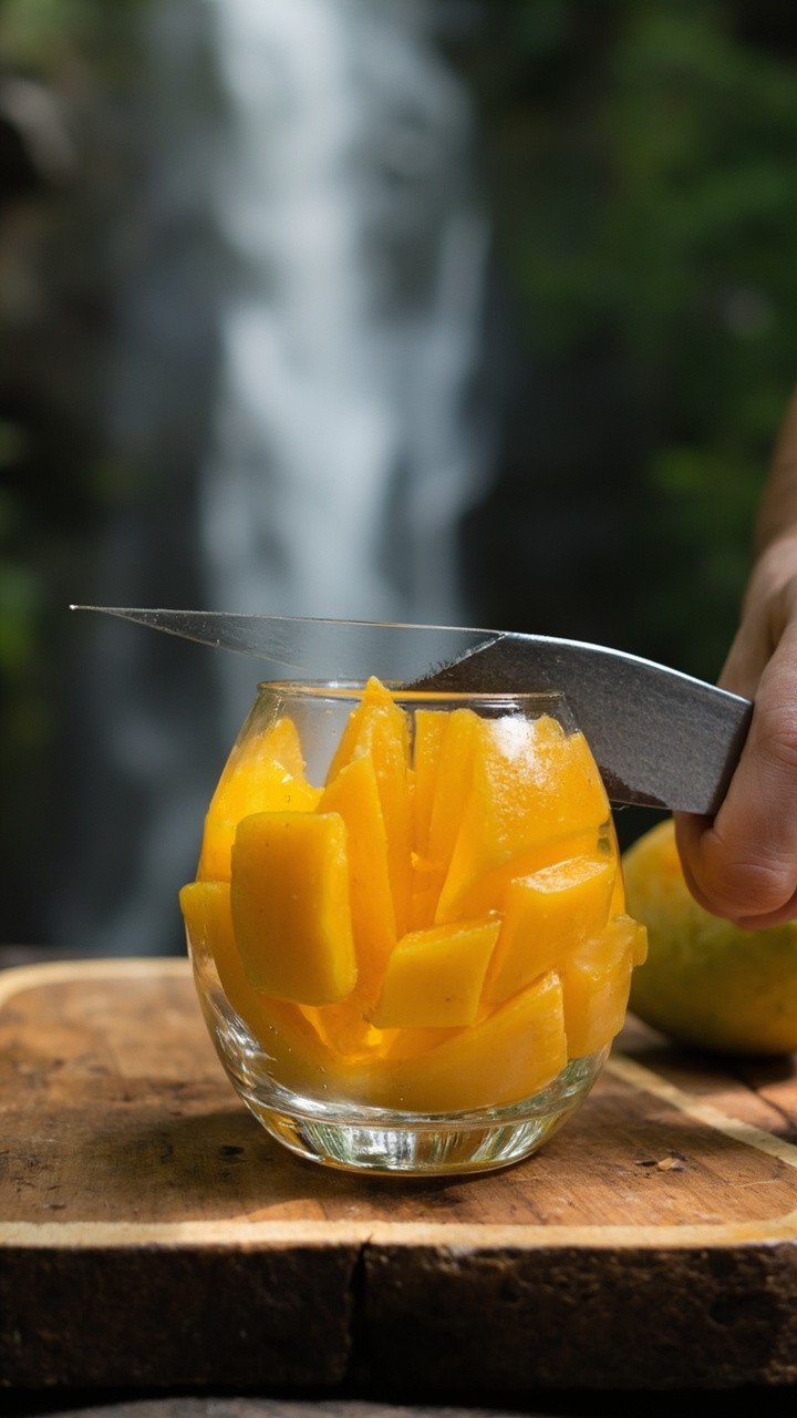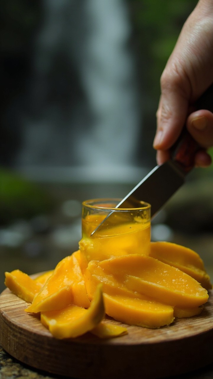 Close-Up Hand Slicing Glass-like Mango with Waterfall Background